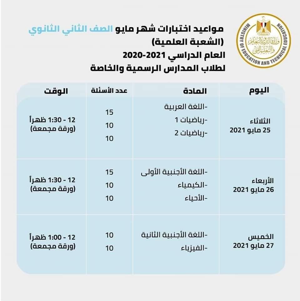 أصدرت وزارة التربية والتعليم المصرية جدول السنة الثانية للسنة الثانية من الفصل الدراسي الثاني لعام 2021. والجدول الزمني كالتالي: –