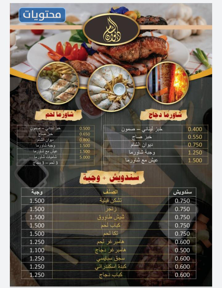 يقدم مطعم ديوان الشام أفضل أنواع الشاورما والمشاوي والأطباق الشامية الخاصة ، ويتم تقديم قائمة المطعم بالأسعار التالية: