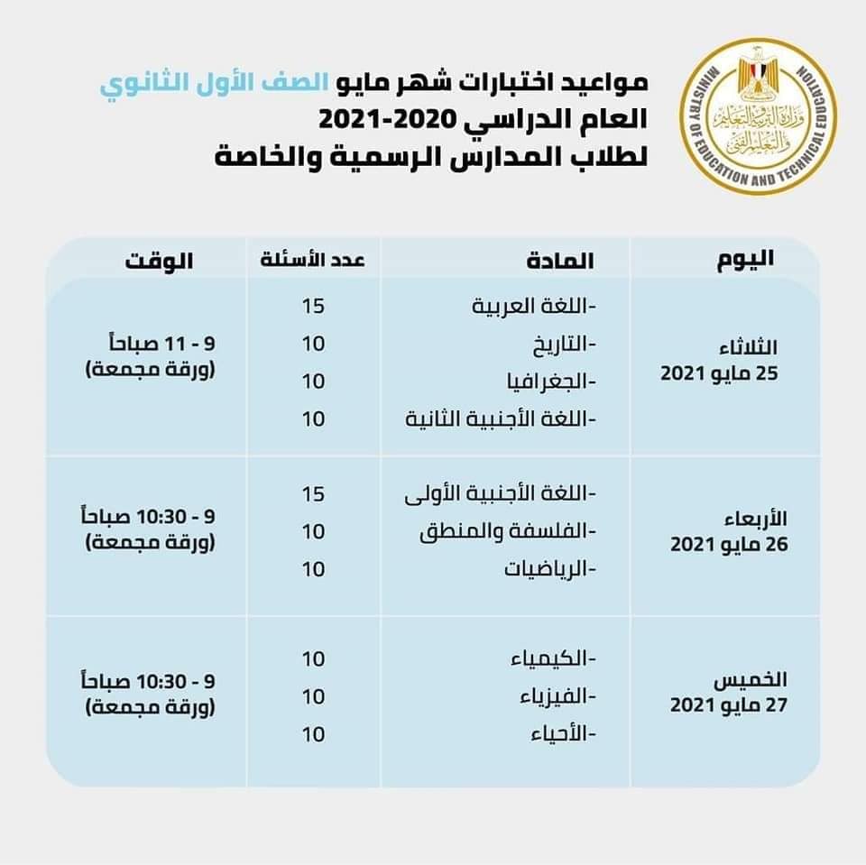 مايو 2021 جدول امتحانات الصف الأول المتوسط: –