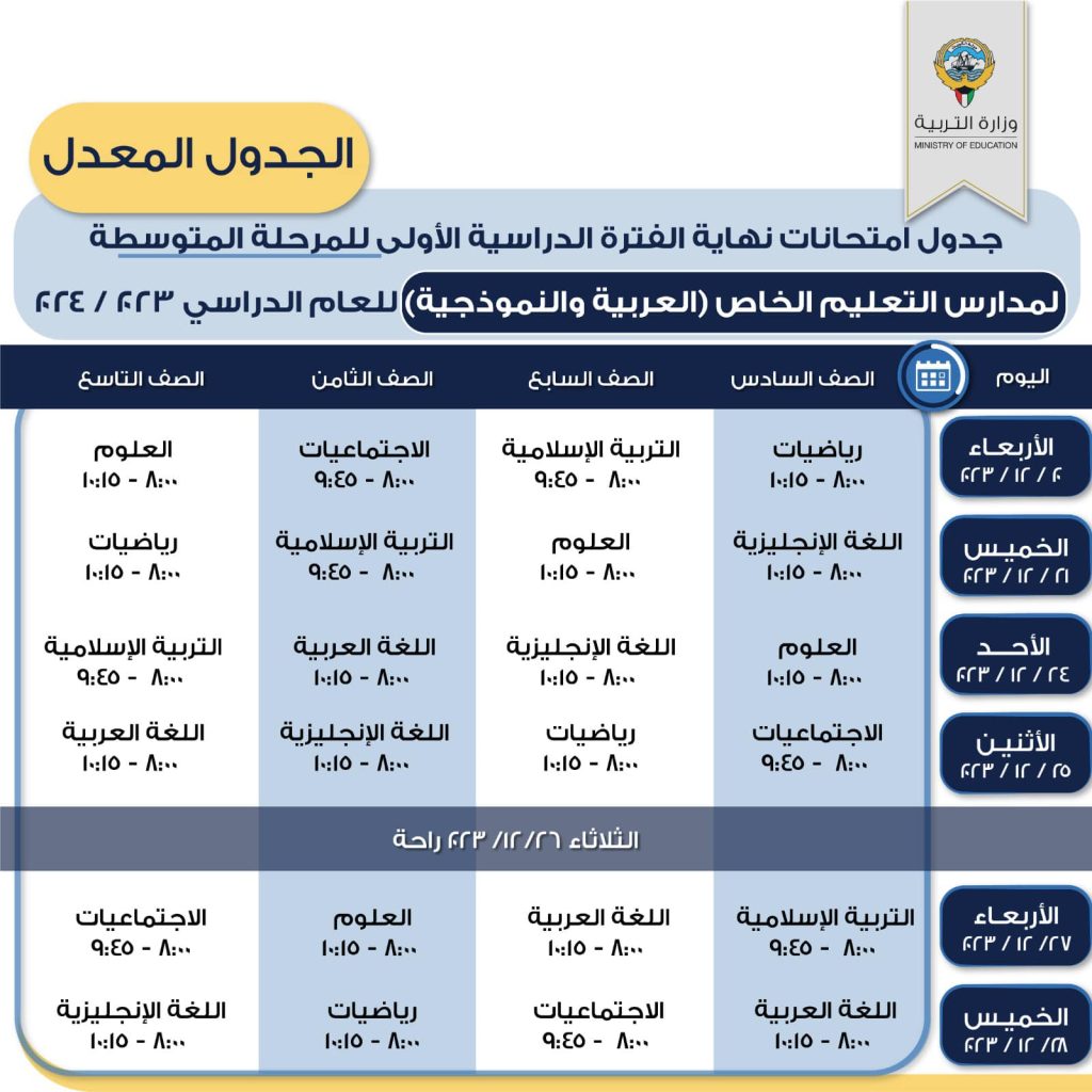 جدول الامتحانات المعدل للمرحلة المتوسطة لمدارس التعليم الخاص العربية والنموذجية
