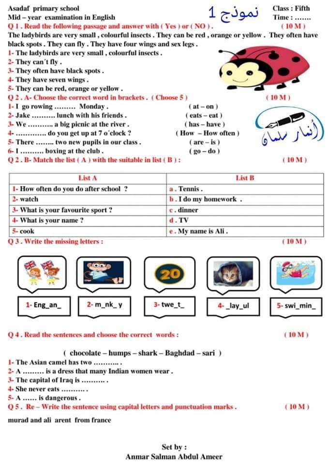 نموذج اسئلة امتحان الشهر الثالث انكليزي خامس E ( مع الاجوبه والحلول )